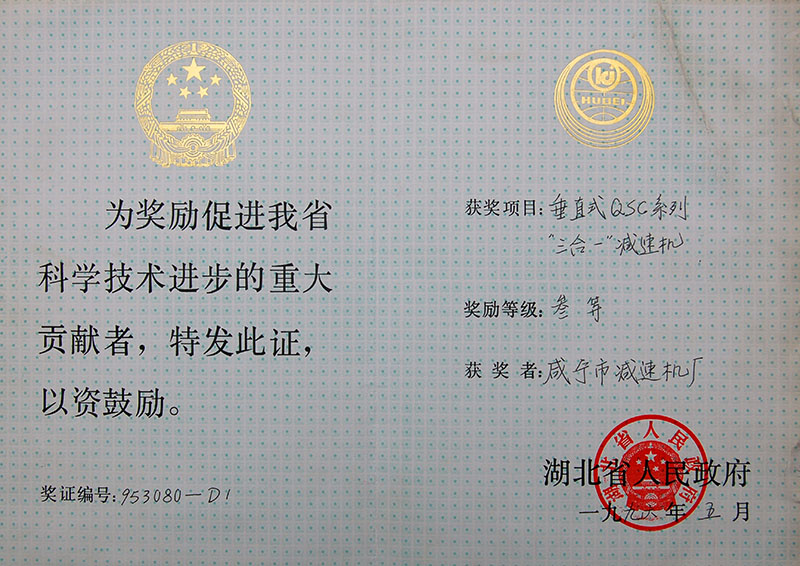 :QS系列減速器機械電子工業(yè)部科技進步三等獎